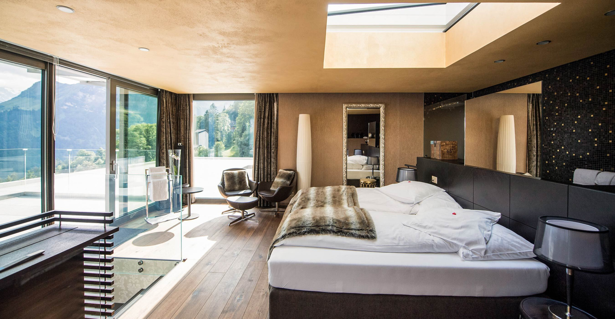 Die doppelstöckige Suite deckt alle Bedürfnisse für einen aufregenden und trotzdem erholsamen Aufenthalt ab. Dank modernster Einrichtung ist die ganze Familie wohl behütet und kann sich verwöhnen lassen, die Grossen vielleicht im Whirlpool, und die Kleinen ganz sicher auf der zimmereigenen Rutschbahn. Der Wohnbereich lädt zum Träumen und Verweilen ein, an der Wandtafel können Sie sich kreativ austoben, und das Panorama-Dachfenster offenbart nachts einen Blick auf den fantastischen Sternenhimmel. Sie werden sich fühlen wie in Tausendundeiner Nacht. Und am Tag geniessen Sie die beste Aussicht des ganzen Hotels, nur für sich.
