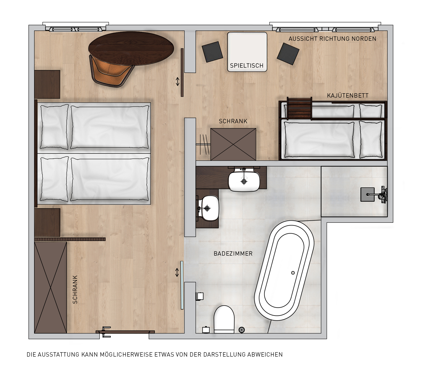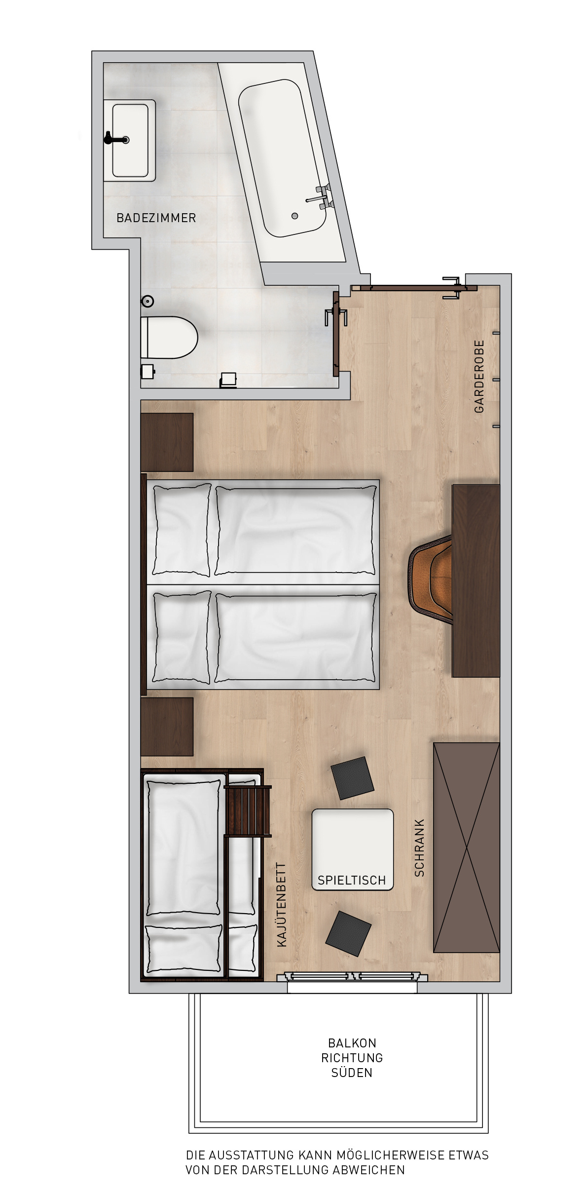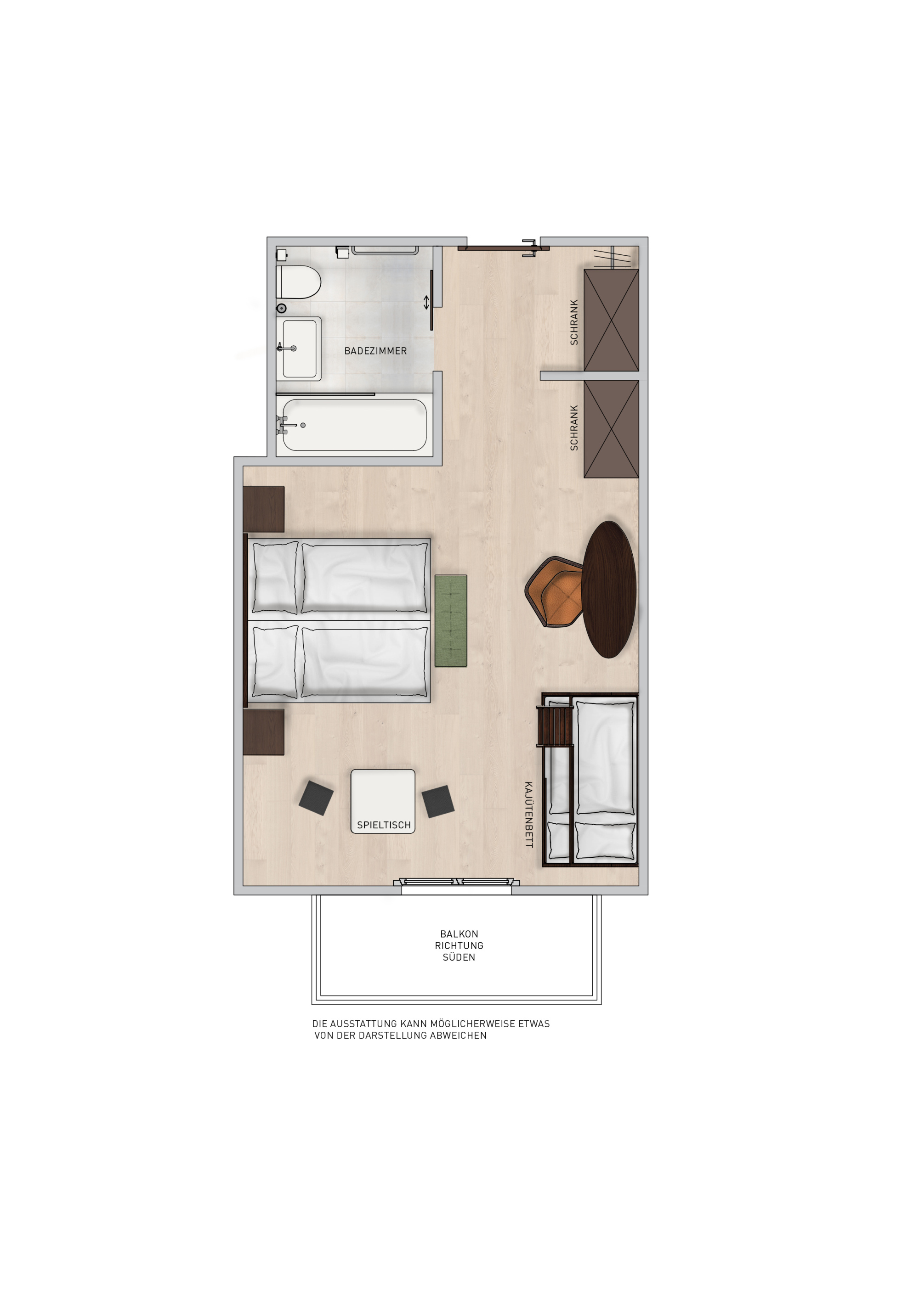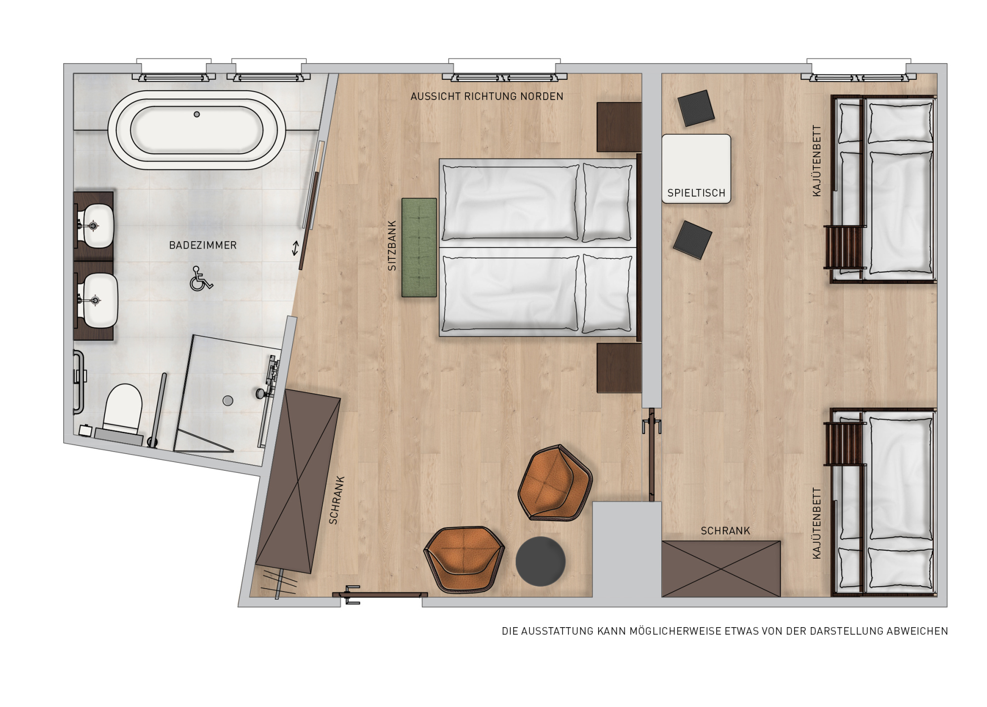 Mit ihrer modernen Einrichtung begeistert das Zimmer jeden Liebhaber des guten Geschmacks. Eine gemütliche Atmosphäre, in der sich auch Kinder rundum wohl fühlen. Für Ihre Kinder stehen im separaten Zimmer zwei Kajüten-Bett mit Rausfallschutz bereit, ein Kind schläft jeweils oben, eines unten. Zusätzlich kann die untere Etage zu einem Baby-Gitterbett umfunktioniert werden. Erfrischen Sie sich mit einem kostenlosen Elmer Mineralwasser oder Elmer Citro aus der Minibar und entspannen Sie abends in der Badewanne des modernen Badezimmers. Die Suite ist auf die Nordseite ausgerichtet und ohne Balkon. Durch die Fenster blicken Sie auf die Go-Kartbahn im Sommer, sowie auf den leicht bewaldeten Hang hinter dem Hotel.
