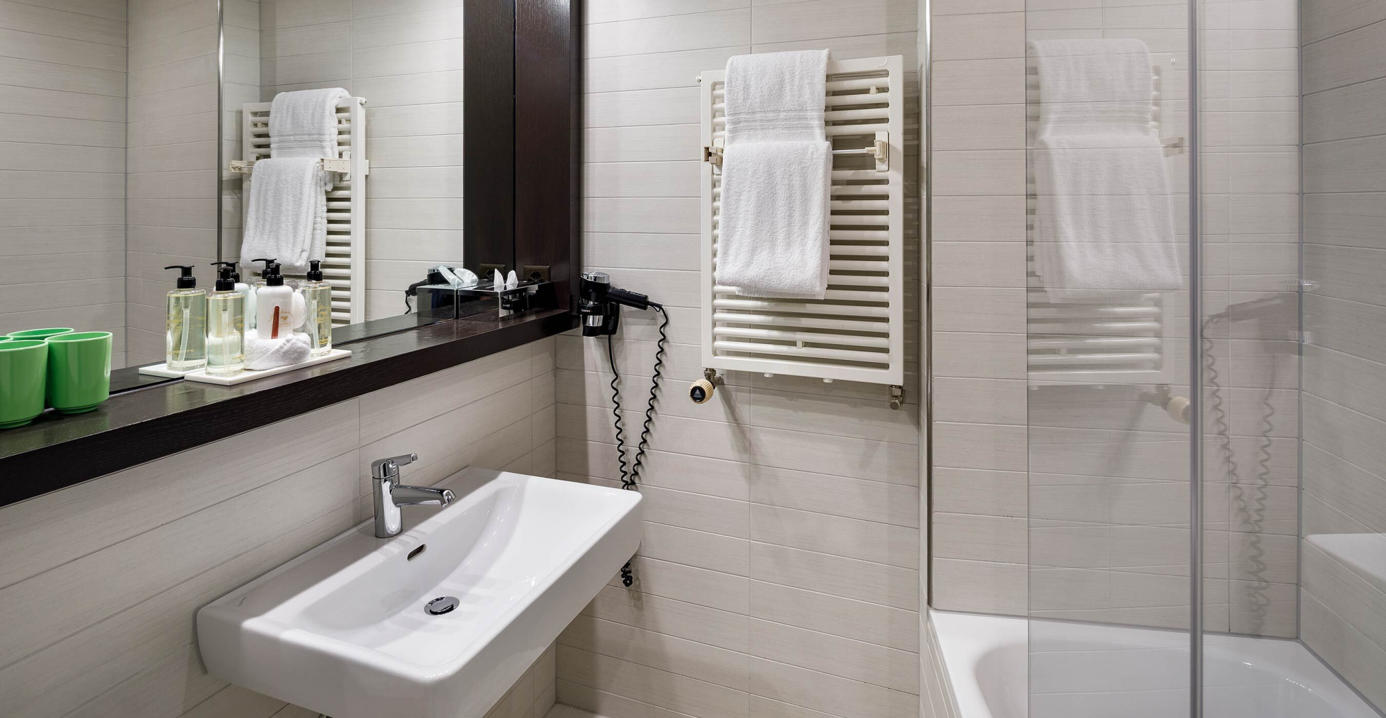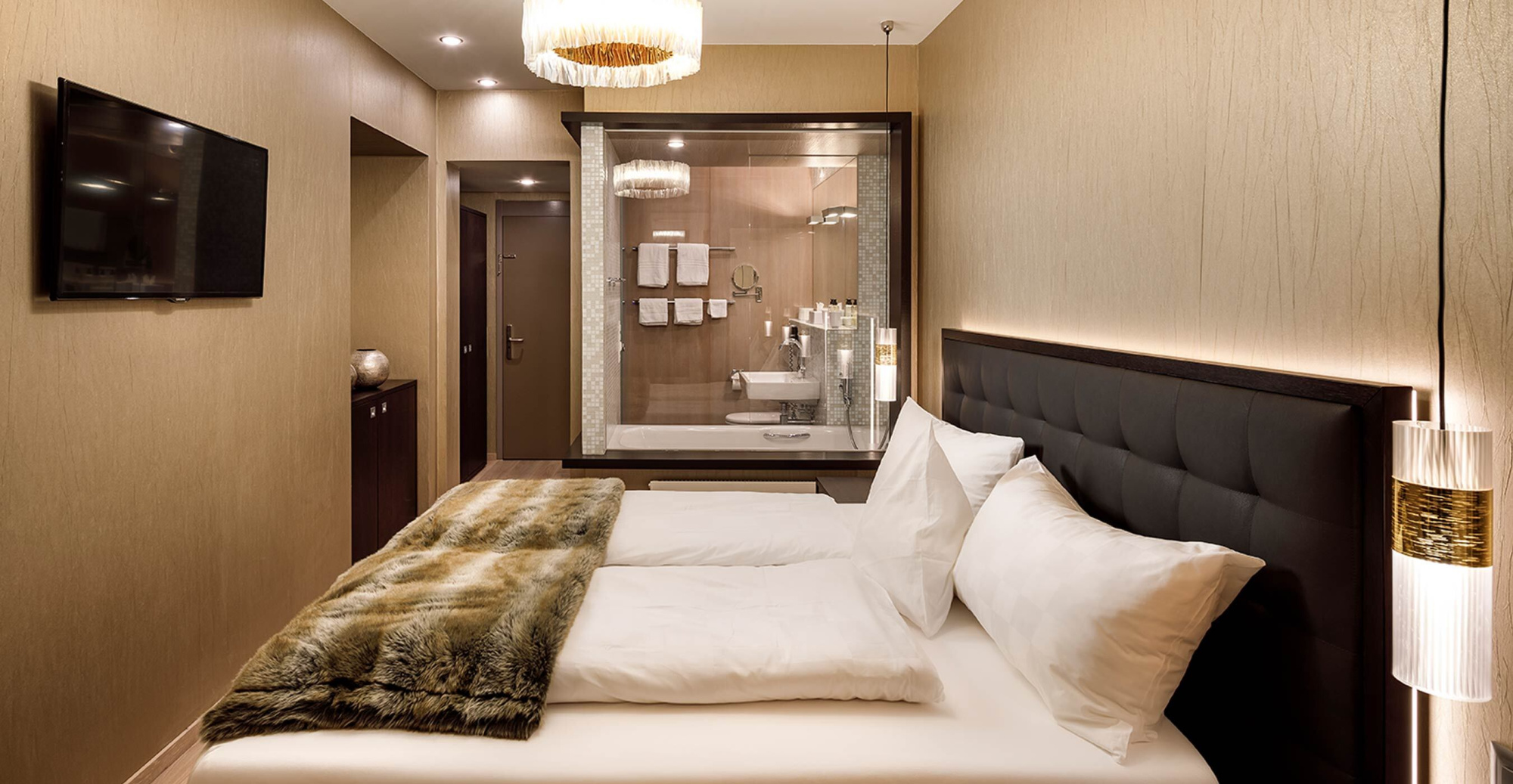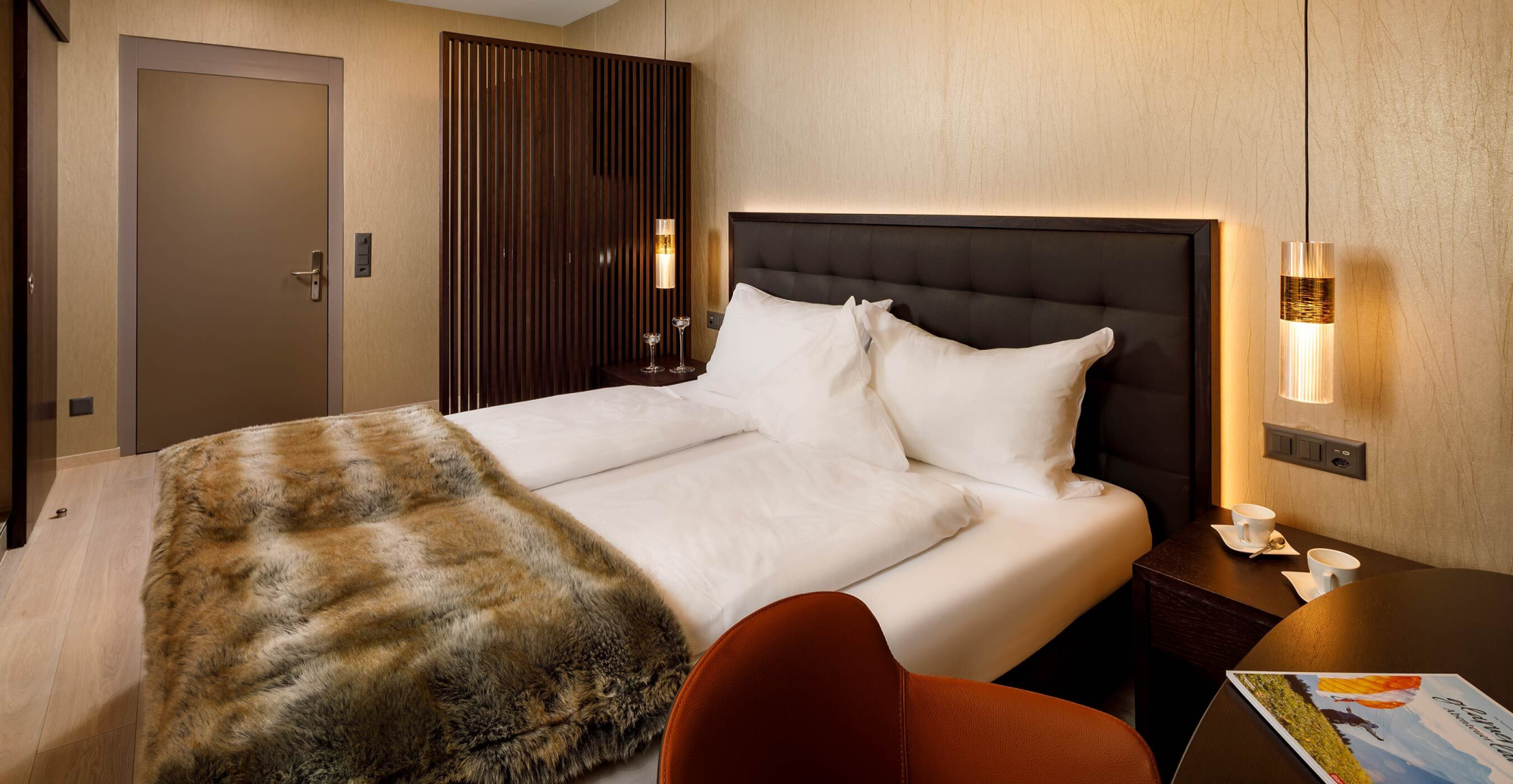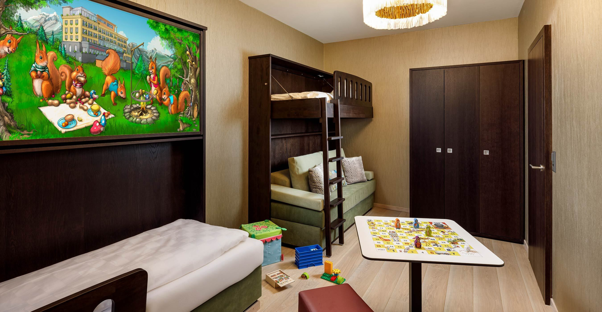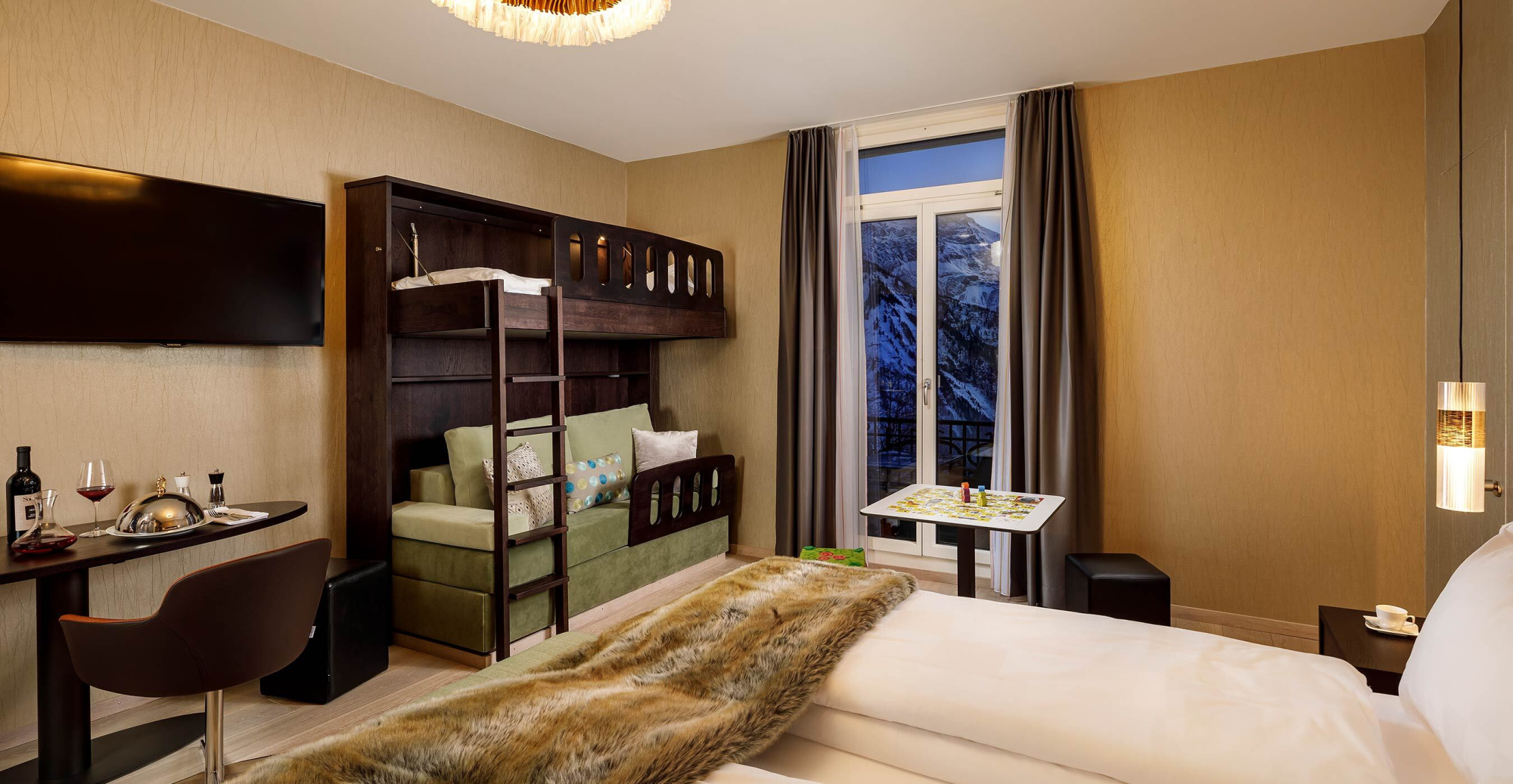Mit ihrer modernen Einrichtung begeistert das Zimmer jeden Liebhaber des guten Geschmacks. Eine gemütliche Atmosphäre, in der sich auch Kinder rundum wohl fühlen. Für Ihre Kinder stehen im separaten Zimmer zwei Kajüten-Bett mit Rausfallschutz bereit, ein Kind schläft jeweils oben, eines unten. Zusätzlich kann die untere Etage zu einem Baby-Gitterbett umfunktioniert werden. Erfrischen Sie sich mit einem kostenlosen Elmer Mineralwasser oder Elmer Citro aus der Minibar und entspannen Sie abends in der Badewanne des modernen Badezimmers. Die Suite ist auf die Nordseite ausgerichtet und ohne Balkon. Durch die Fenster blicken Sie auf die Go-Kartbahn im Sommer, sowie auf den leicht bewaldeten Hang hinter dem Hotel.
